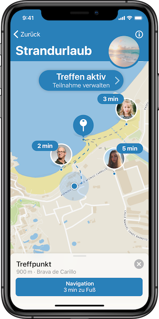 Ort auswählen und sehen, wann Familie, Freunde und Bekannte am Treffpunkt ankommen – nie wieder Fragen wie wo bleibst du?