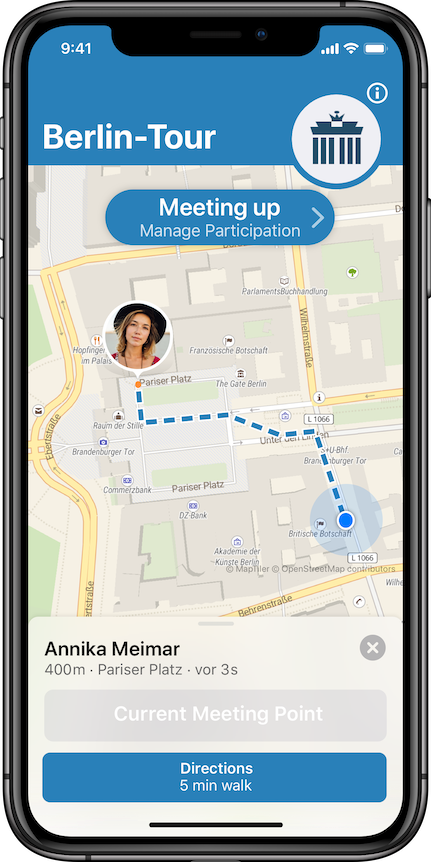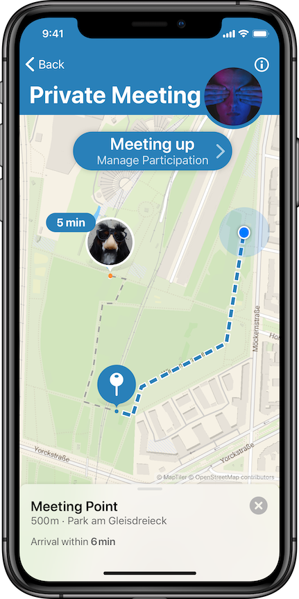 Du willst dich treffen? Lade die Personen über deinen Lieblingsmessenger oder direkt in der App ein. Sobald sie dem Treffen zustimmen, könnt ihr (und nur ihr) euch und eure Ankunftszeiten in Echtzeit auf einer Karte sehen.