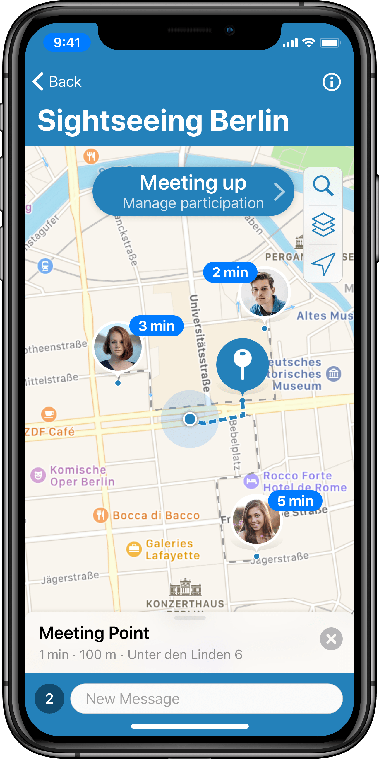 TICE zeigt die berechneten Ankunftszeiten der Gruppenmitglieder, navigiert dich zum Treffpunkt und sagt dir Bescheid, falls jemand später kommt. Außerdem kannst du mit deiner Gruppe jederzeit chatten.